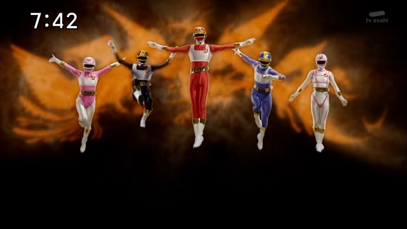 Description: A group of five action figures standing next to each other on a black background with a yellow and orange background.
