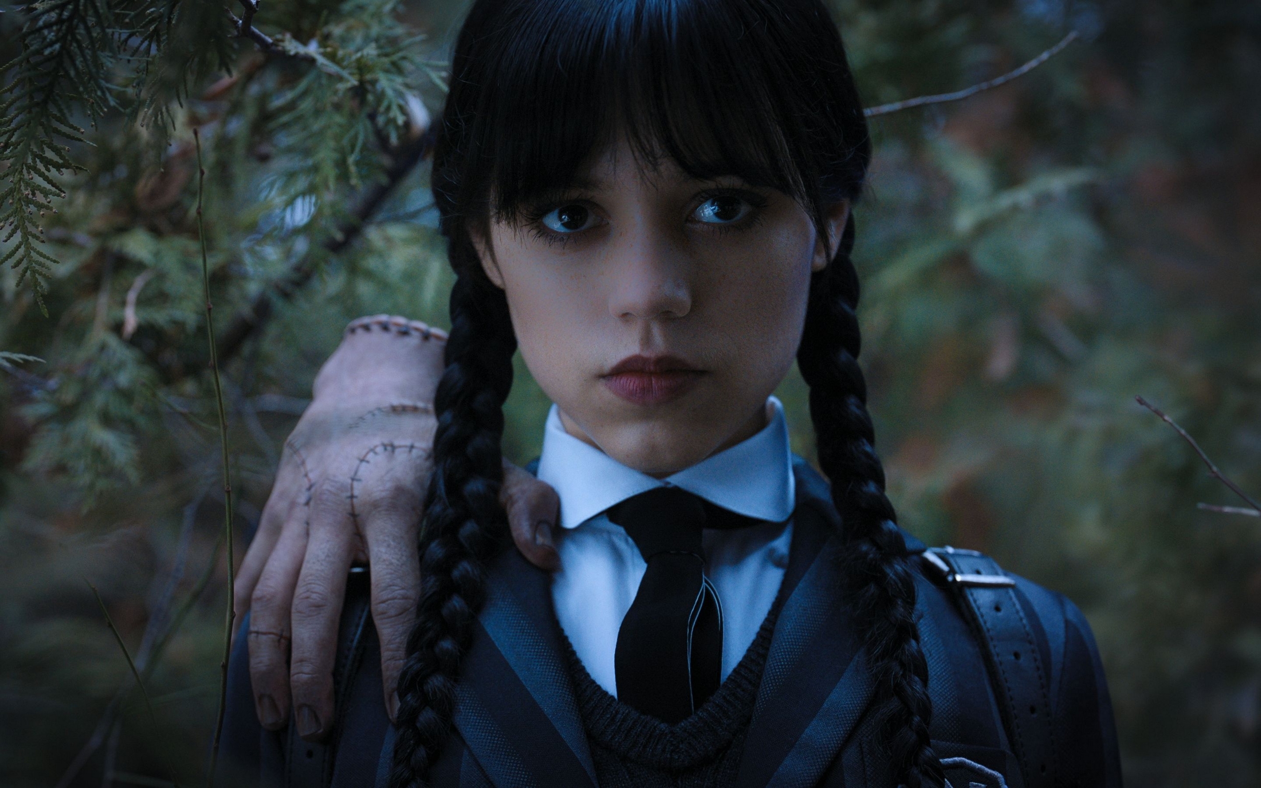 Description: A woman with long hair wearing a black tie and a black jacket and a white shirt and black and white striped tie.