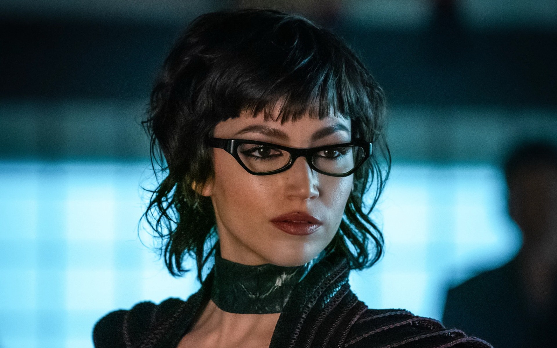 Description: A woman with glasses and a choker on her neck looking at the camera with a serious look on her face.
