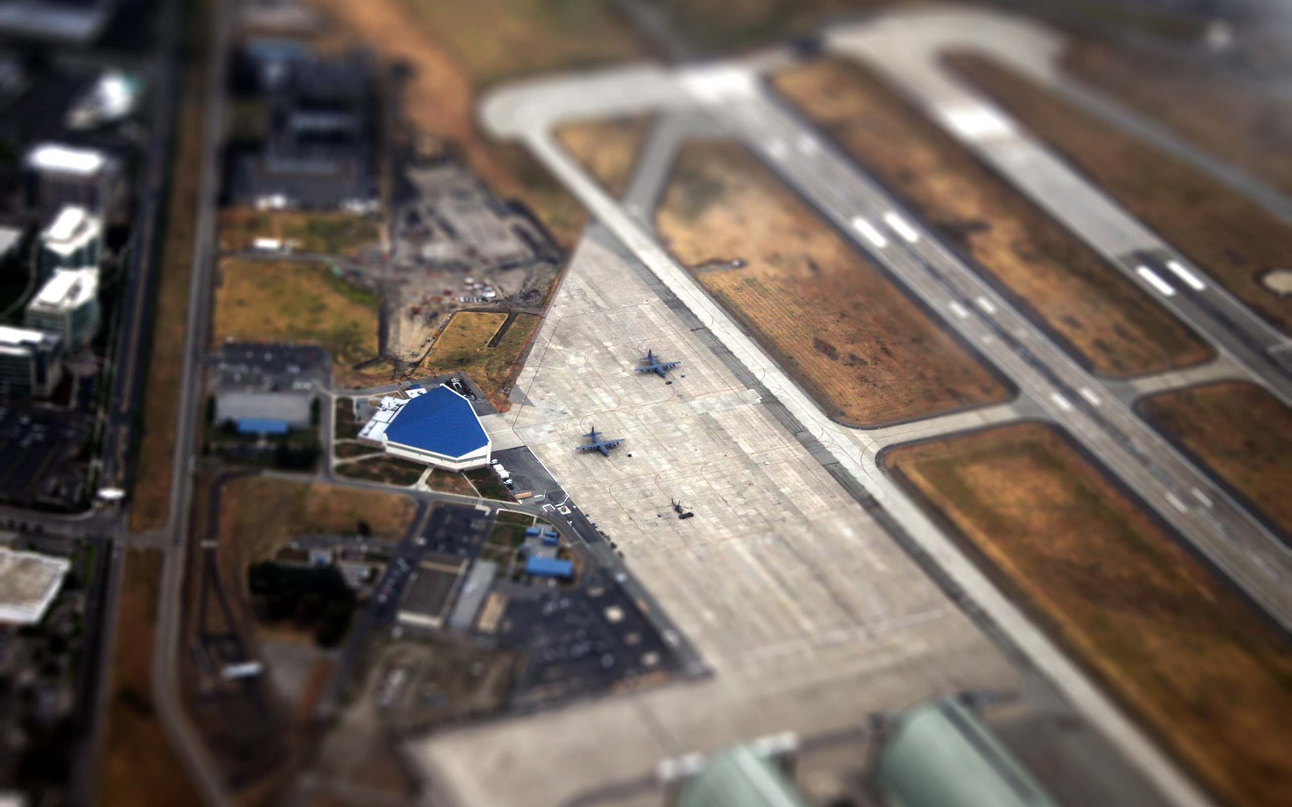 Description: An aerial view of an airport with a blue tarmac and a few planes on the runway and in the background.