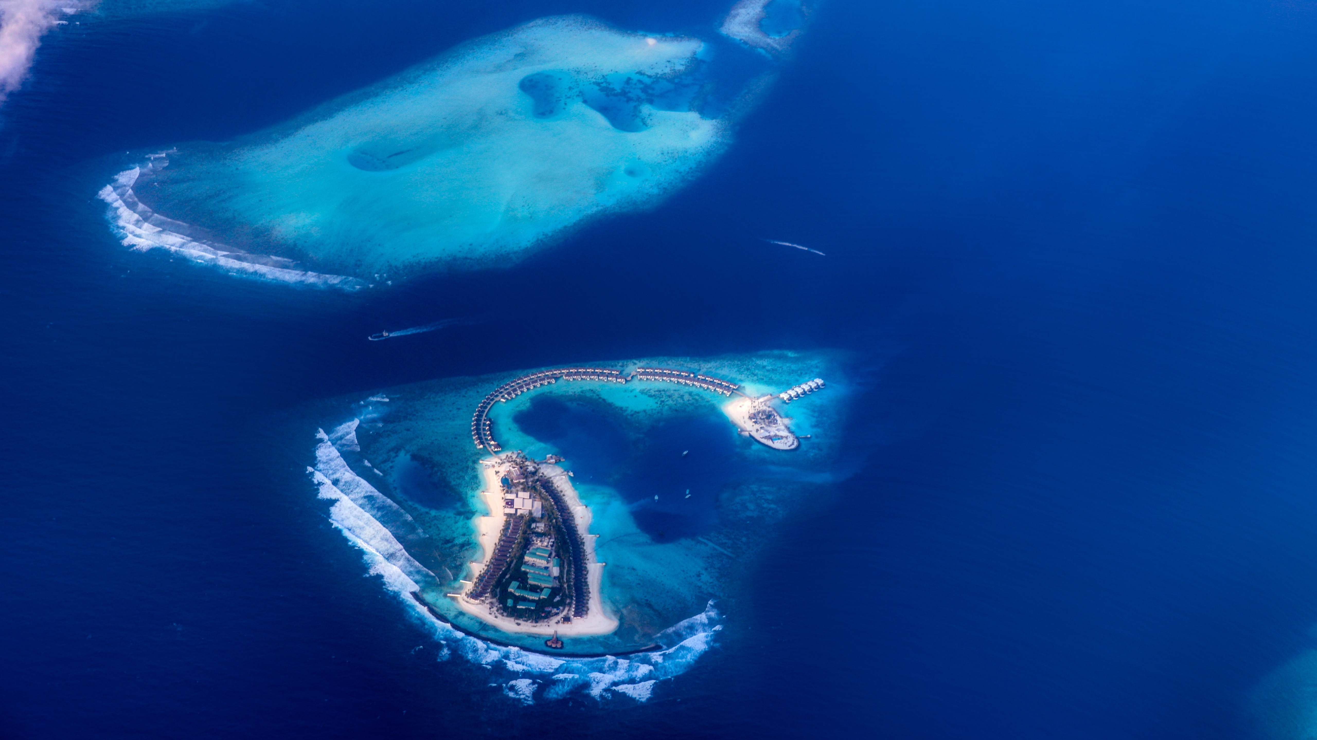 Description: An aerial view of an island in the ocean with a plane flying over it and a plane landing on the island.
