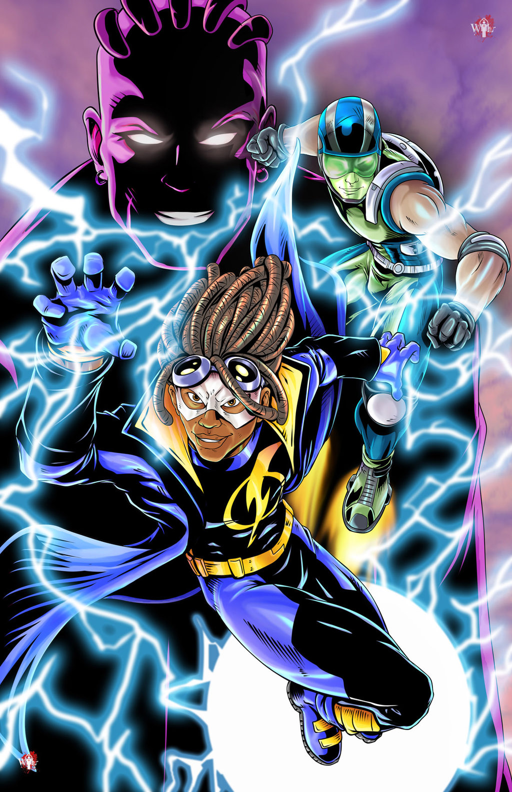 Description: A cartoon of a man with a bat and a woman with a mask on and a lightning background with a black and yellow costume.