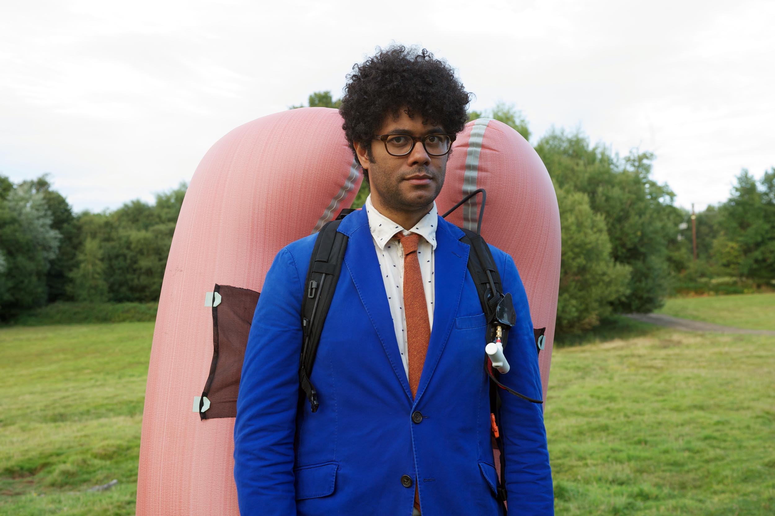 Description: A man in a blue suit and tie standing next to a pink object in a field with trees in the background.