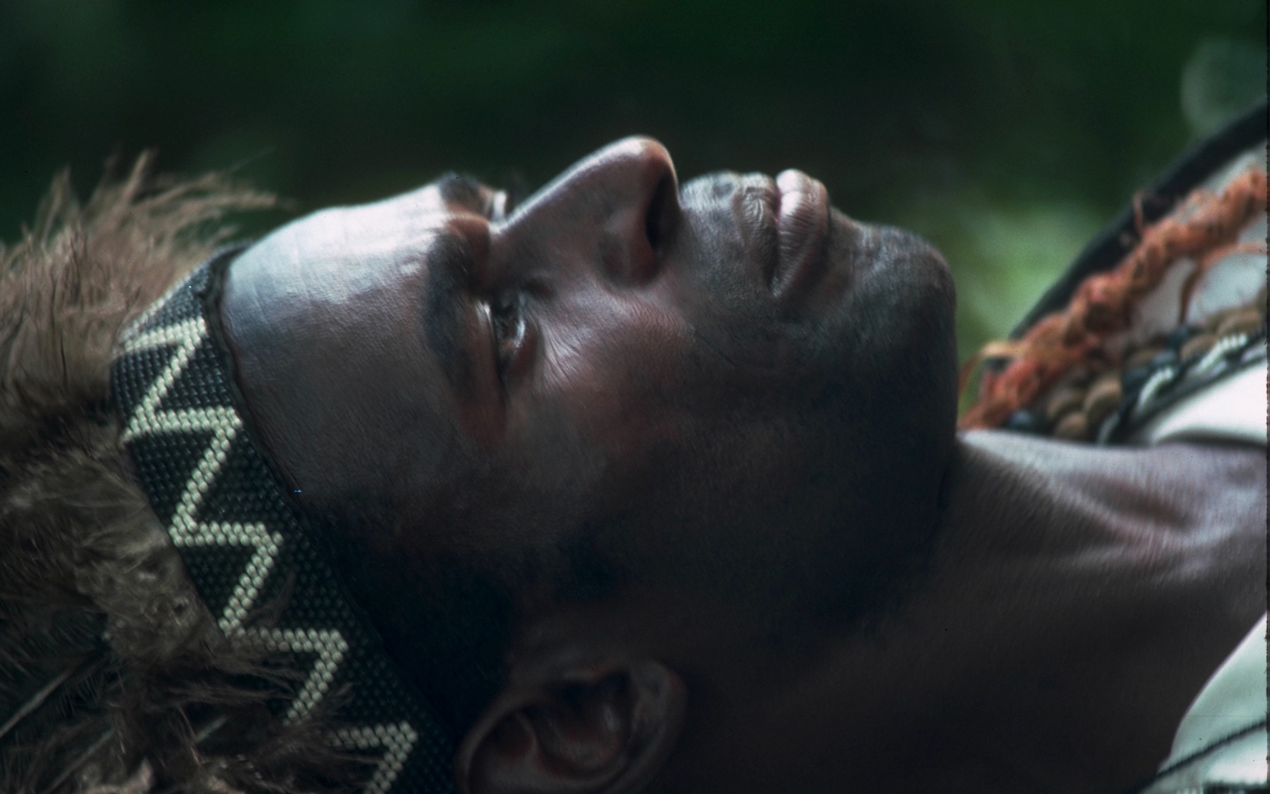 Description: A man with a headband on laying down with his eyes closed and his head turned to the side.