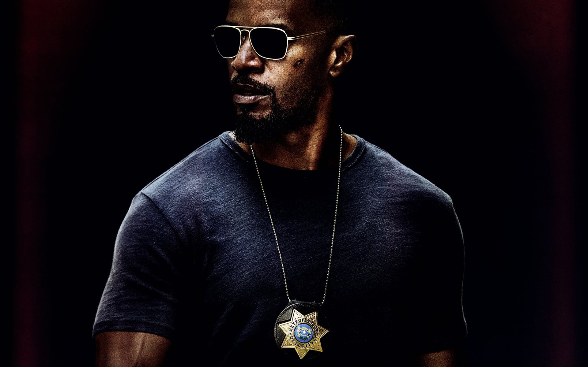 Description: A man wearing sunglasses and a police badge necklace on his neck.