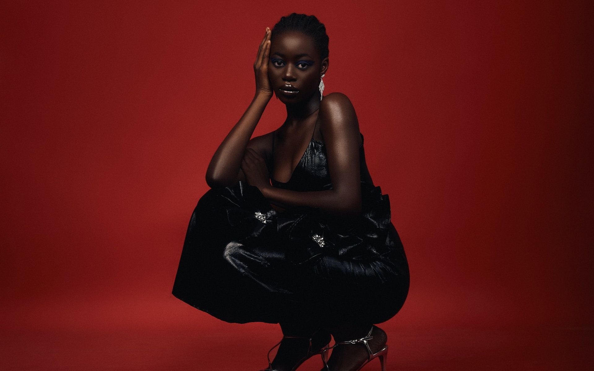 Description: A woman in a black dress and high heels posing for a picture with a red background and a red backdrop.