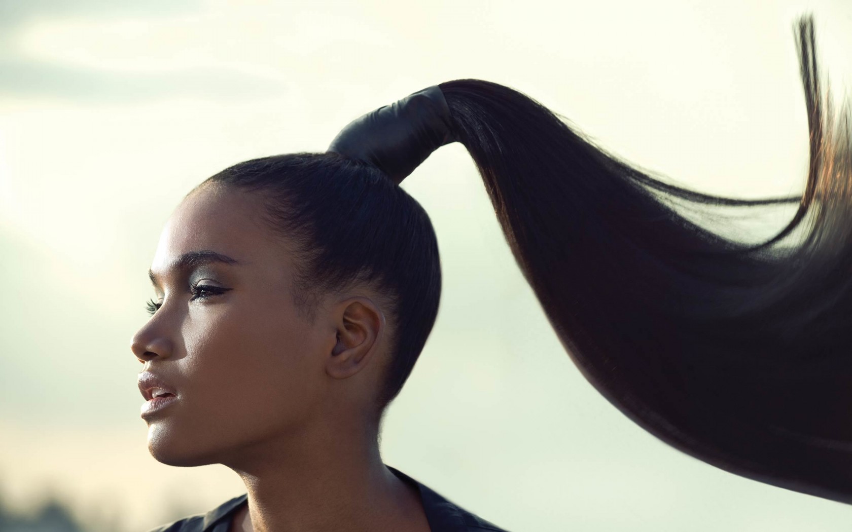 Description: A woman with a ponytail is looking off into the distance with her hair in the air and her eyes closed.