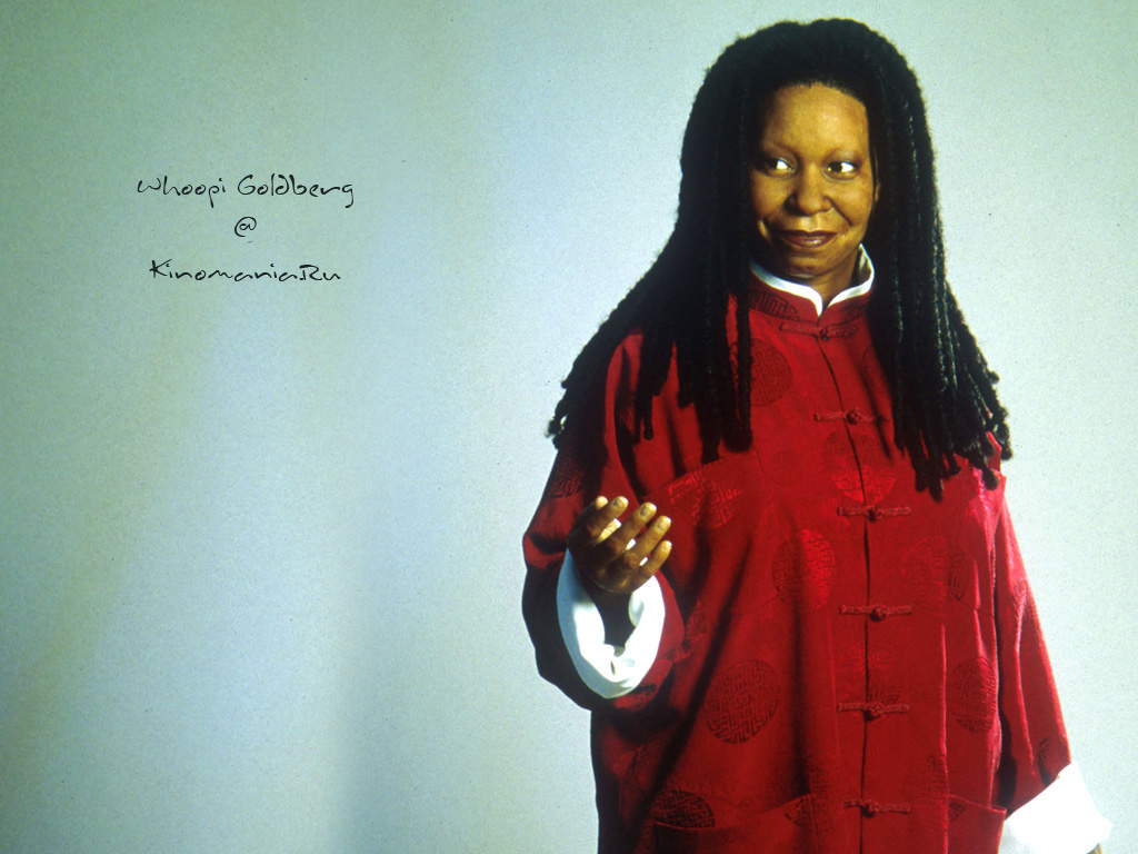 Description: A woman in a red robe holding a white object in her hand and a white background behind her is a white wall.
