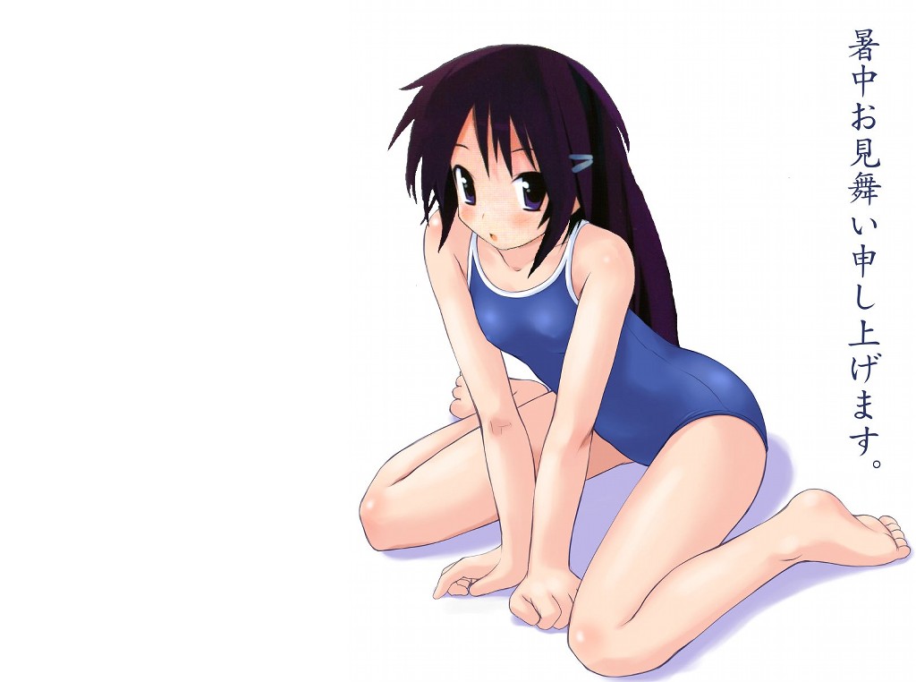 Description: A woman in a blue swimsuit sitting on the ground with her legs crossed and her hand on her head.