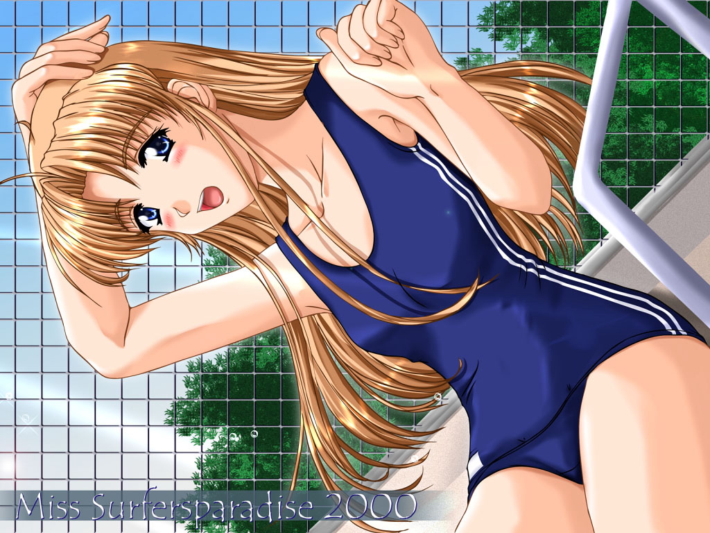 Description: A girl in a blue swimsuit is posing for a picture with her hair blowing in the wind and a tennis net behind her.