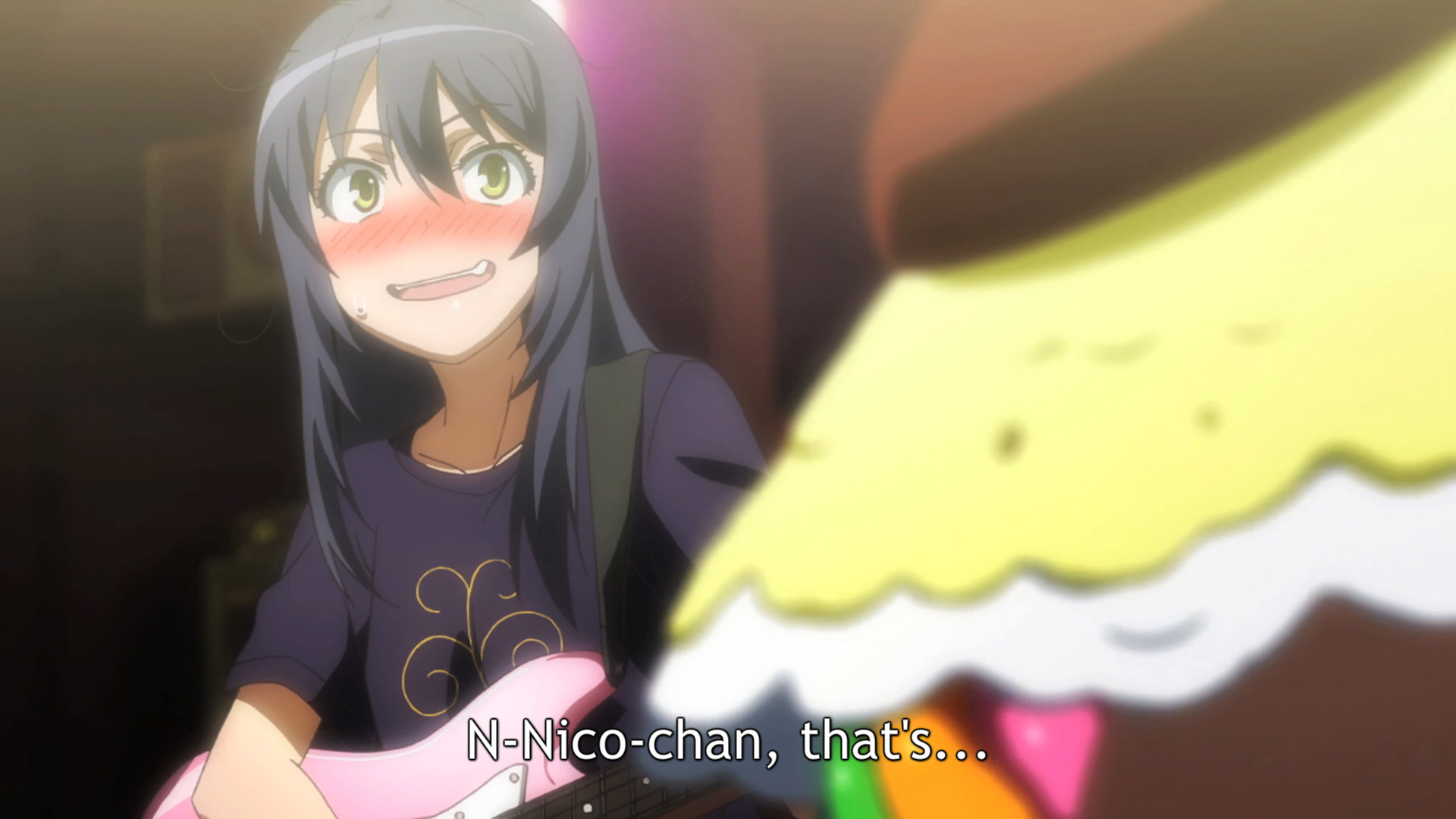 Description: A girl with long black hair and a pink guitar in her hand and a yellow and white object in the background.