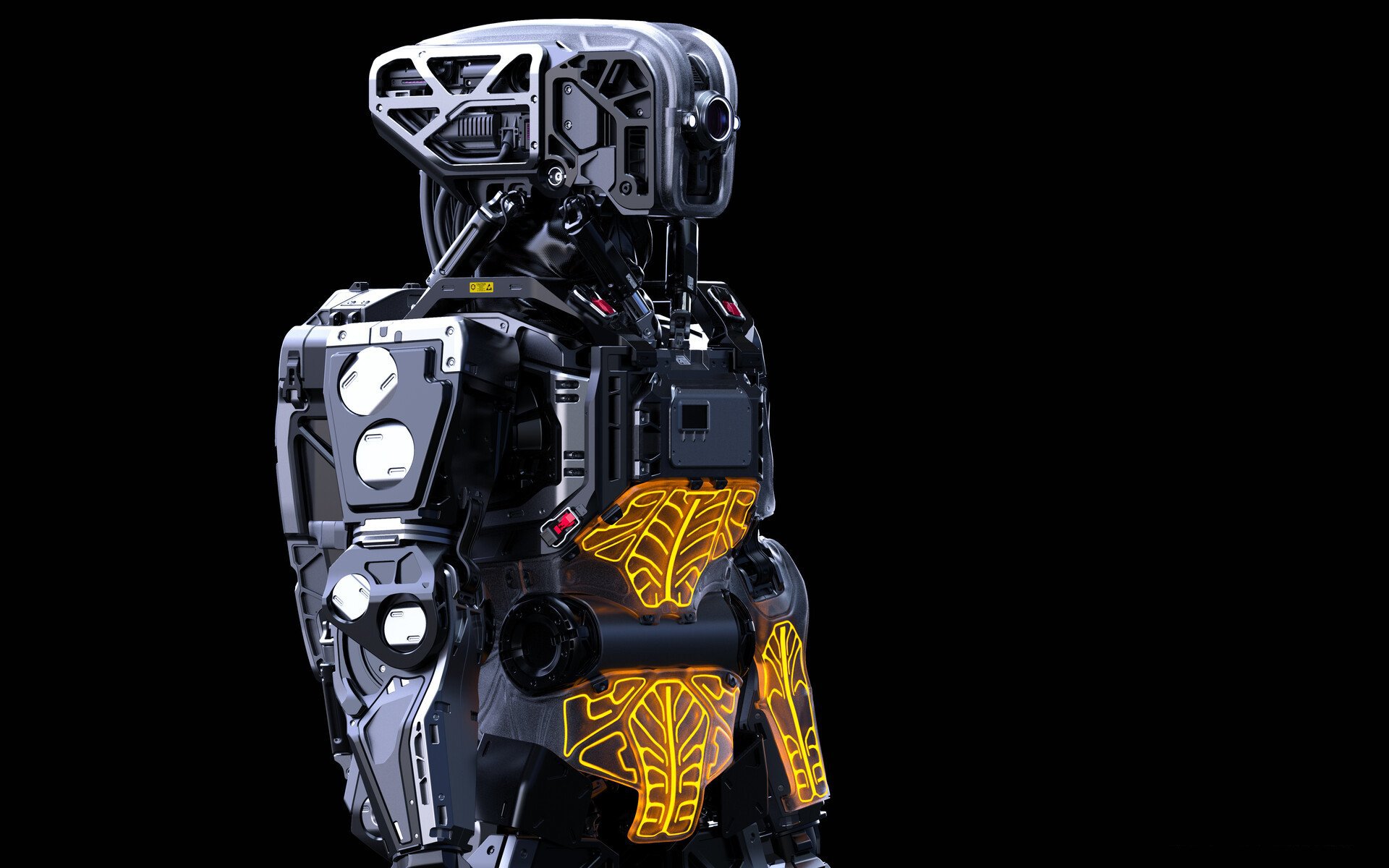 Description: A robot with a yellow and black design on it's body and head and arms and legs.