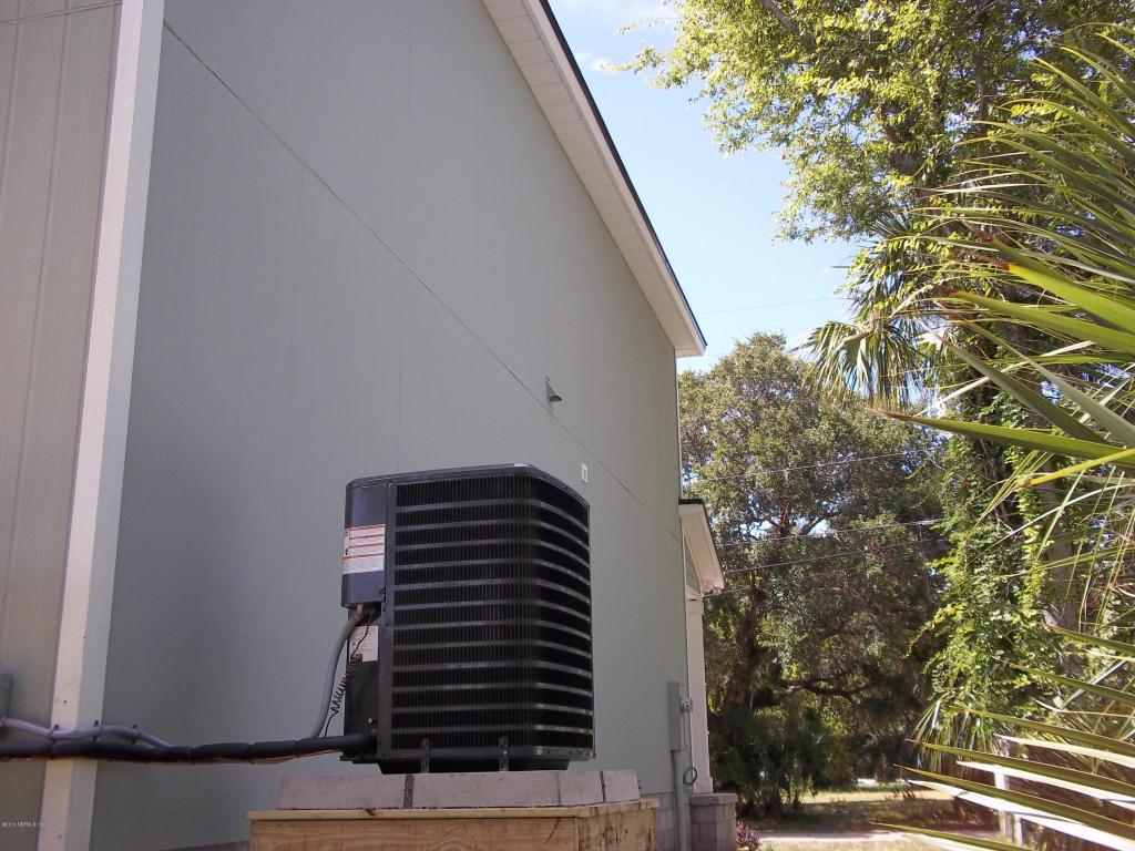 Description: A air conditioner sitting on top of a wooden box outside of a house next to a tree and a fence.