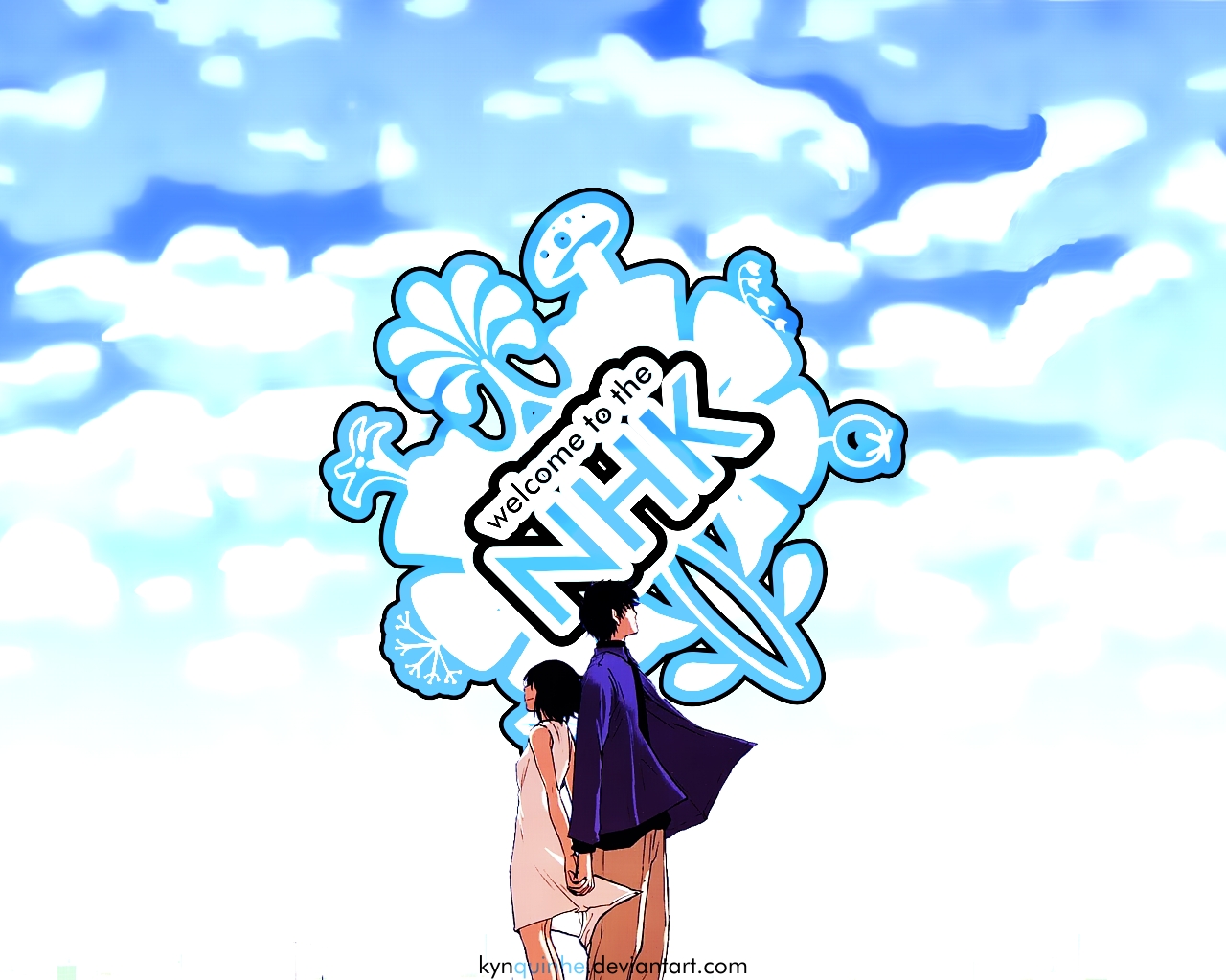 Description: A couple of people standing under a blue sky with clouds behind them and a sign that says air zone.