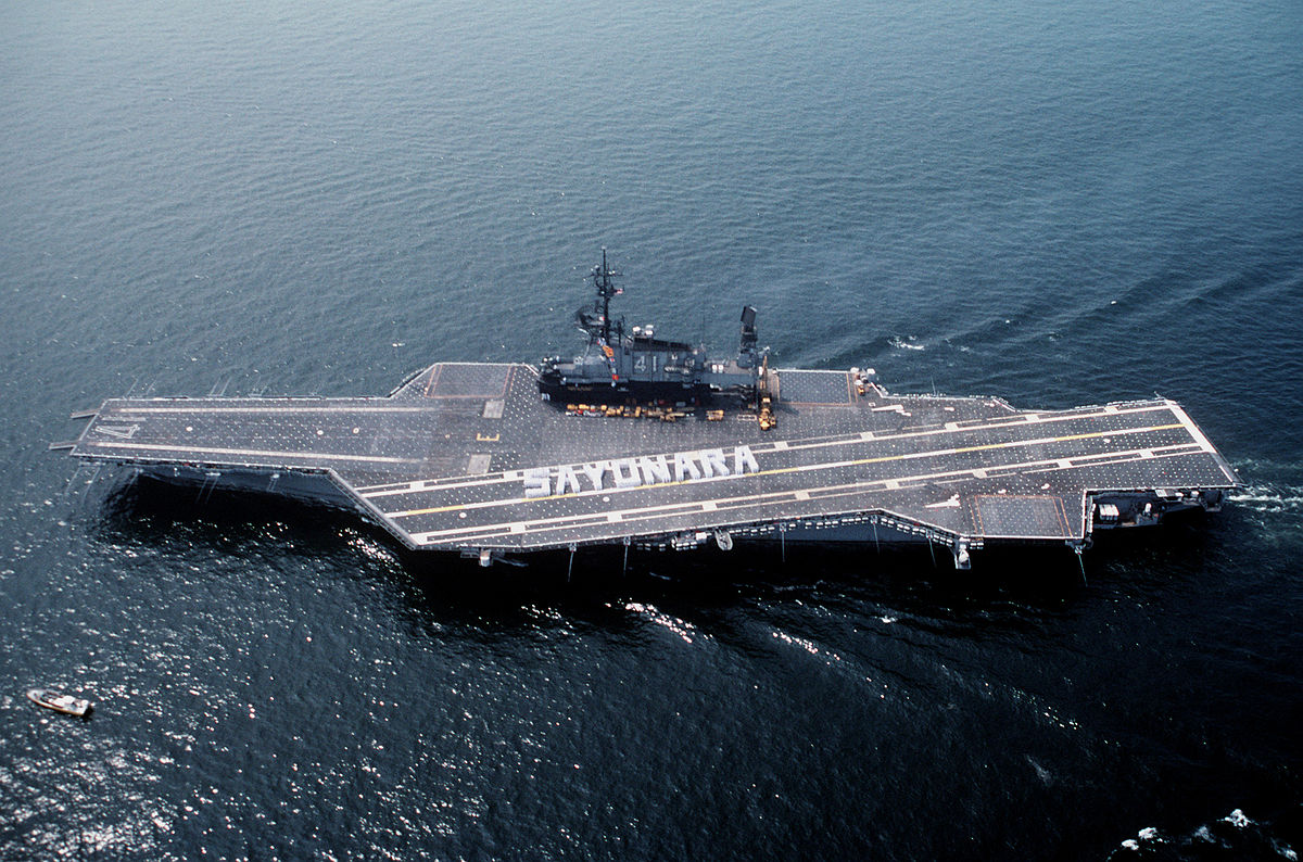 Description: A large aircraft carrier floating on top of the ocean next to a boat in the water with a smaller boat in the background.
