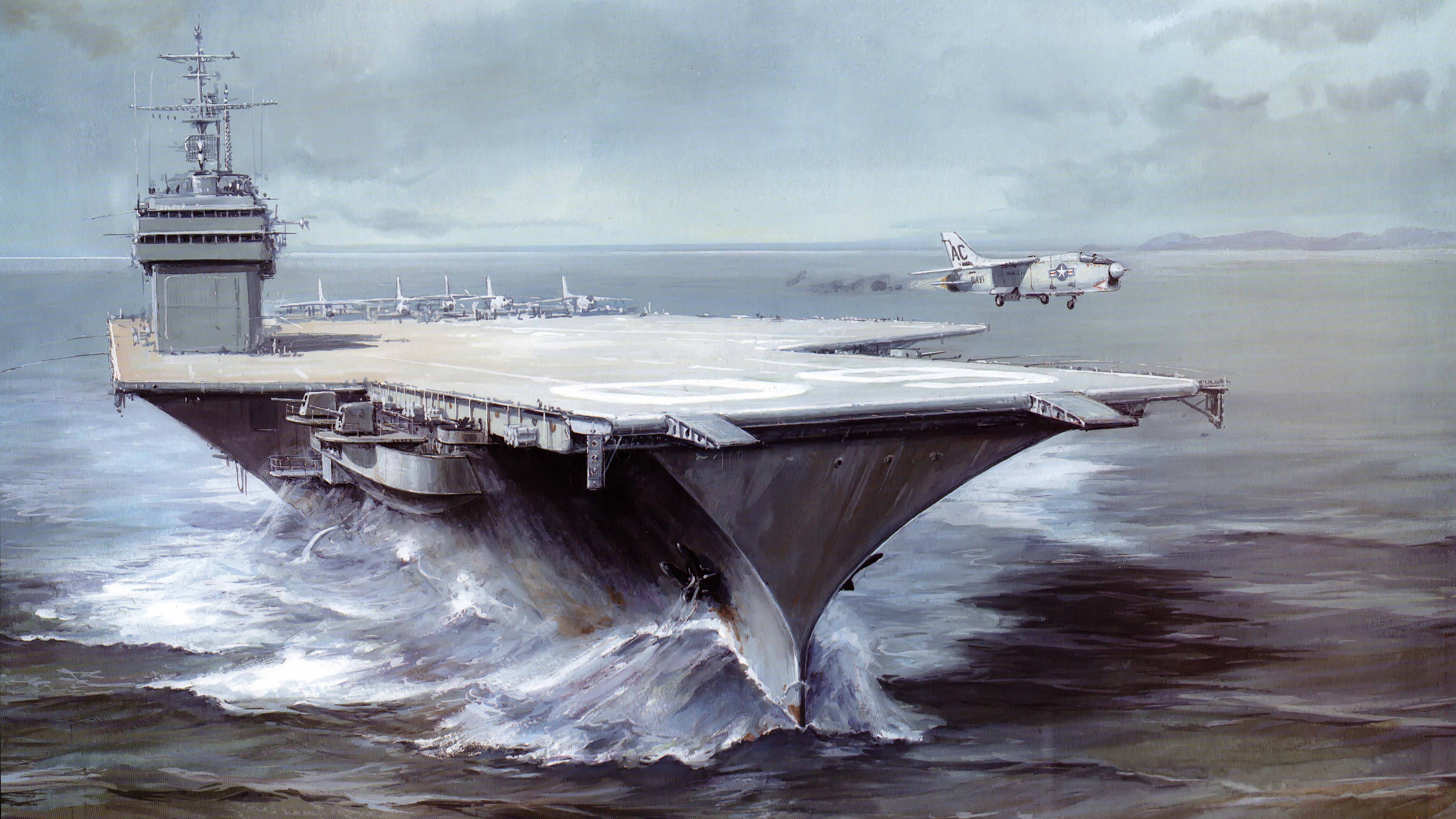Description: A painting of a large aircraft carrier in the ocean with a plane flying over it and another plane in the background.