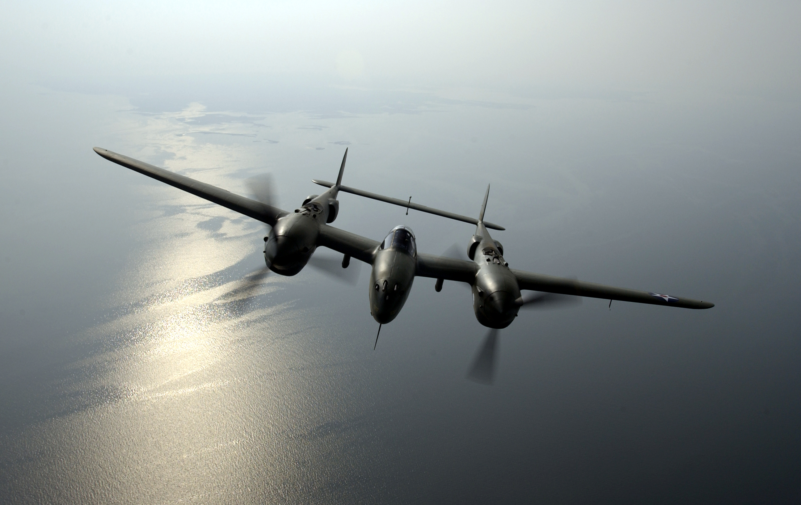 Description: A large air plane flying over a body of water with a sky background and sun reflecting on the water.
