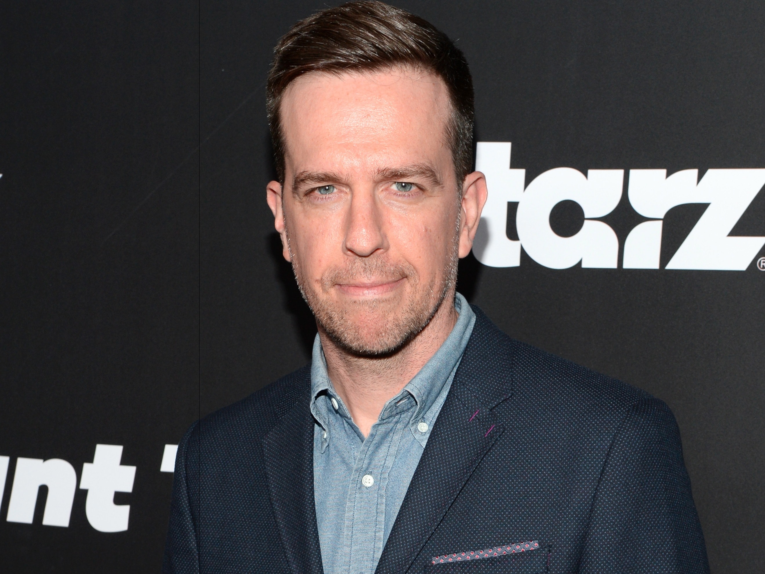 Description: A man in a suit and blue shirt posing for a picture at a party with a black background and a starz logo.