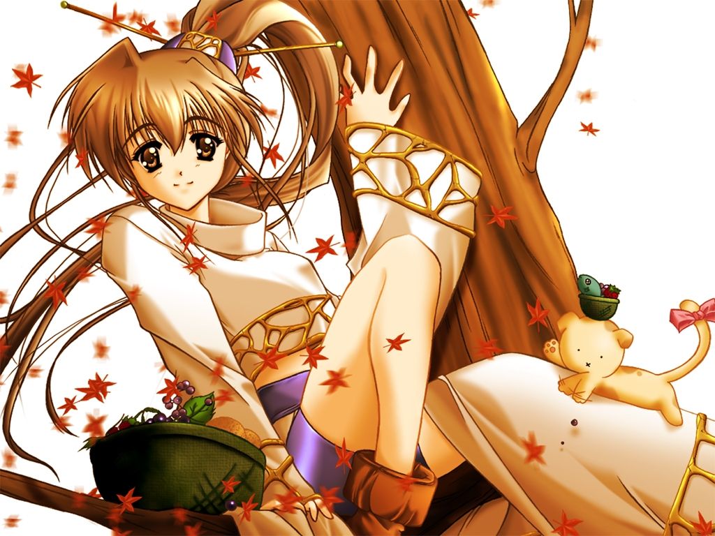 Description: A woman in a costume sitting on a tree branch with a cat on her shoulder and a hat on her head.