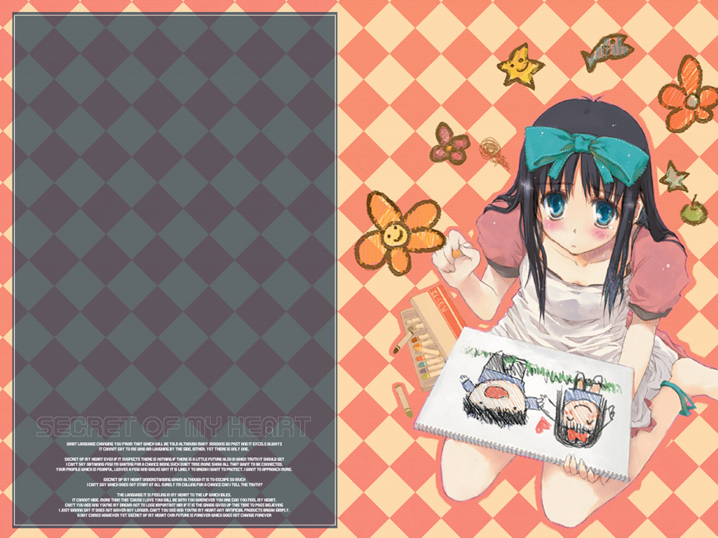 Description: A girl sitting on a checkered floor with a cake in her hand and a book in her lap.