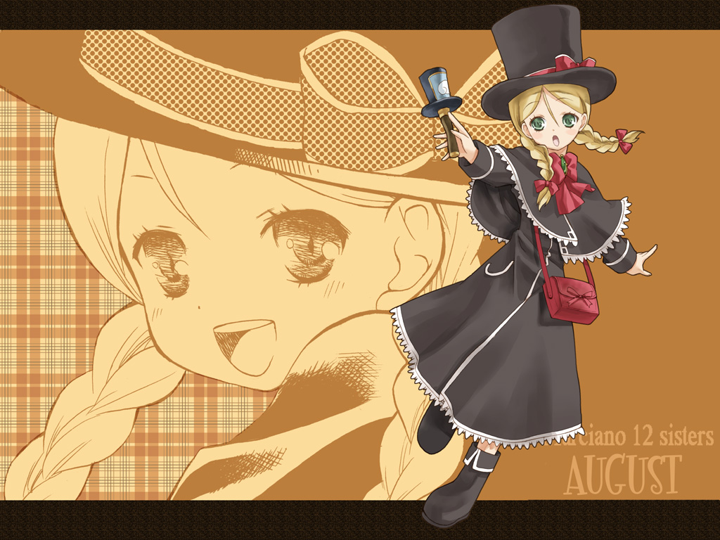 Description: A cartoon character with a hat and a cell phone in her hand and a plaid background with a girl in a top hat.