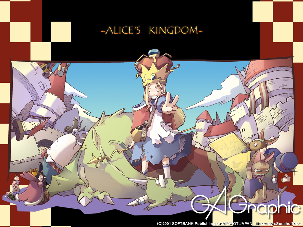Description: A picture of a cartoon character surrounded by other characters and a caption that reads alice's kingdom.