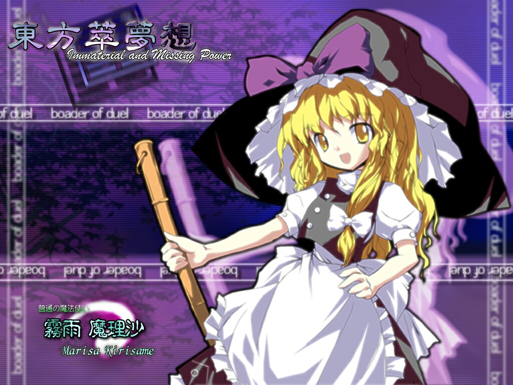 Description: A girl in a white dress holding a broom and a hat on her head.