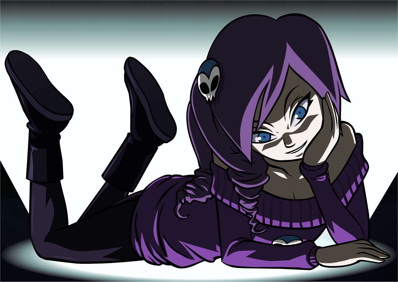 Description: A cartoon character laying on the ground with her legs crossed and her head tilted to the side of her body.