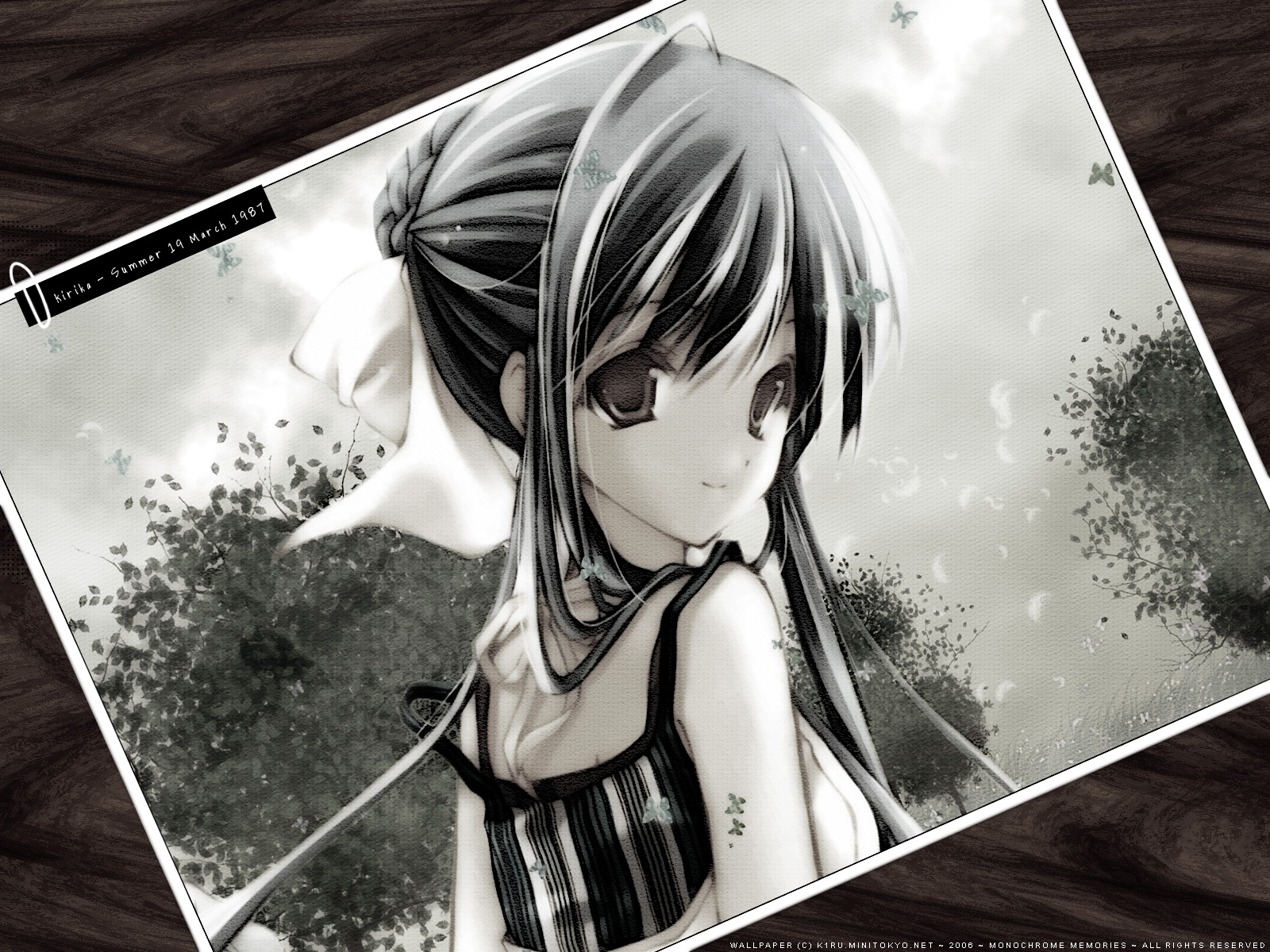 Description: A girl with long hair and a black and white dress is standing in front of a wood background with a picture of her.