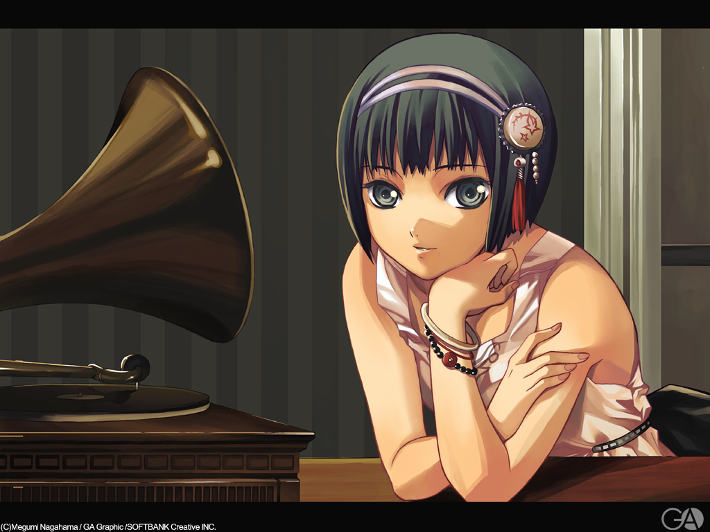 Description: A girl with a headband sitting in front of a record player and a record player on a desk.