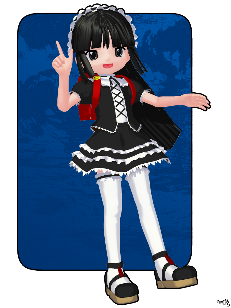Description: A girl in a black and white dress with a red jacket and a red scarf on her head and a peace sign.