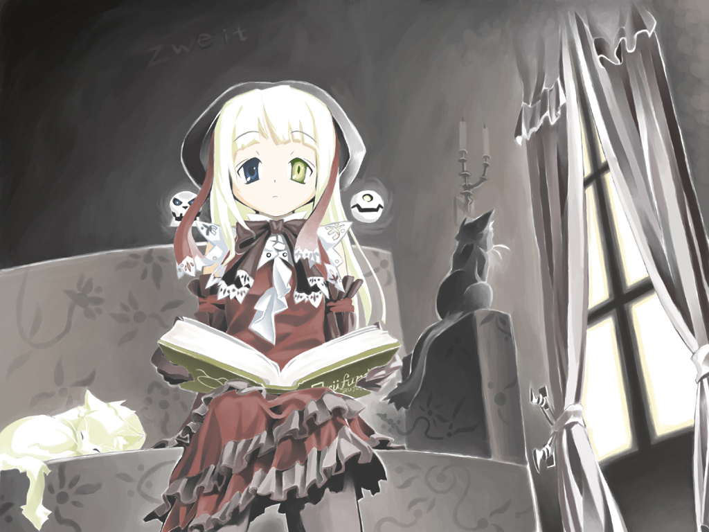 Description: A woman in a dress is reading a book in a room with a cat on the floor and a window.