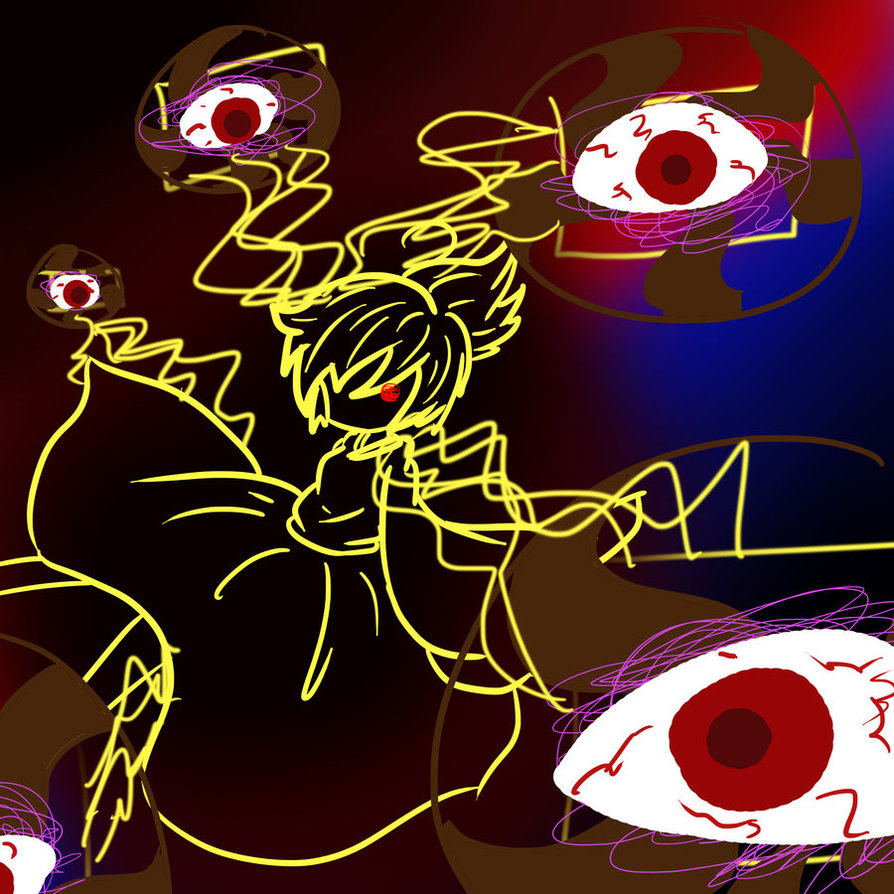 Description: A drawing of a woman with red eyes and a black dress with a red eye on it and a yellow eye on the right.