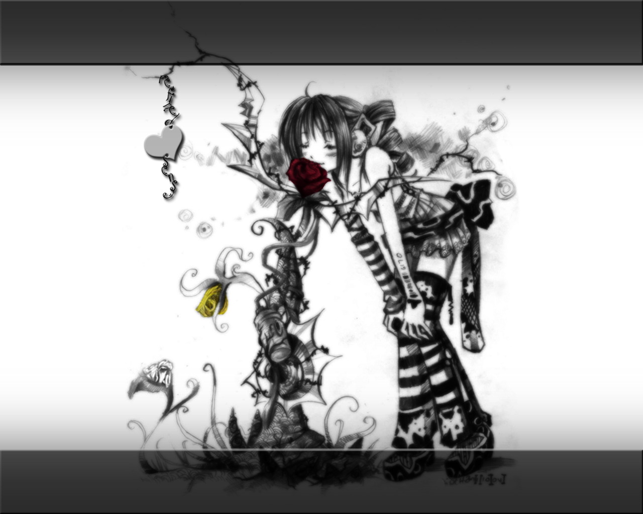 Description: A drawing of a woman with a rose in her hand and a man in a striped suit holding a rose.