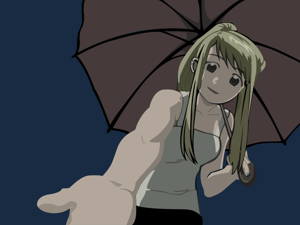 Description: A woman with a black and white shirt holding an umbrella in the dark night sky.