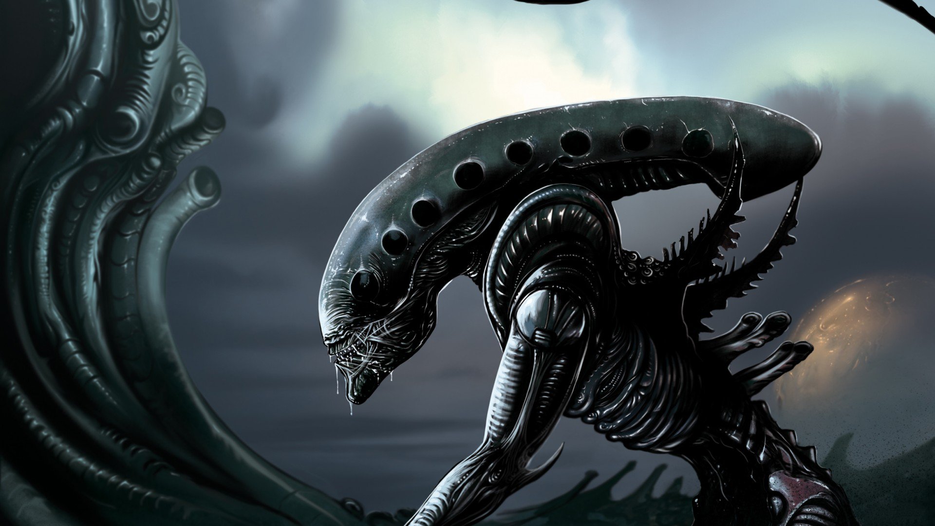 Description: A alien creature with a large head and a large body of body in front of a cloudy sky with a light.