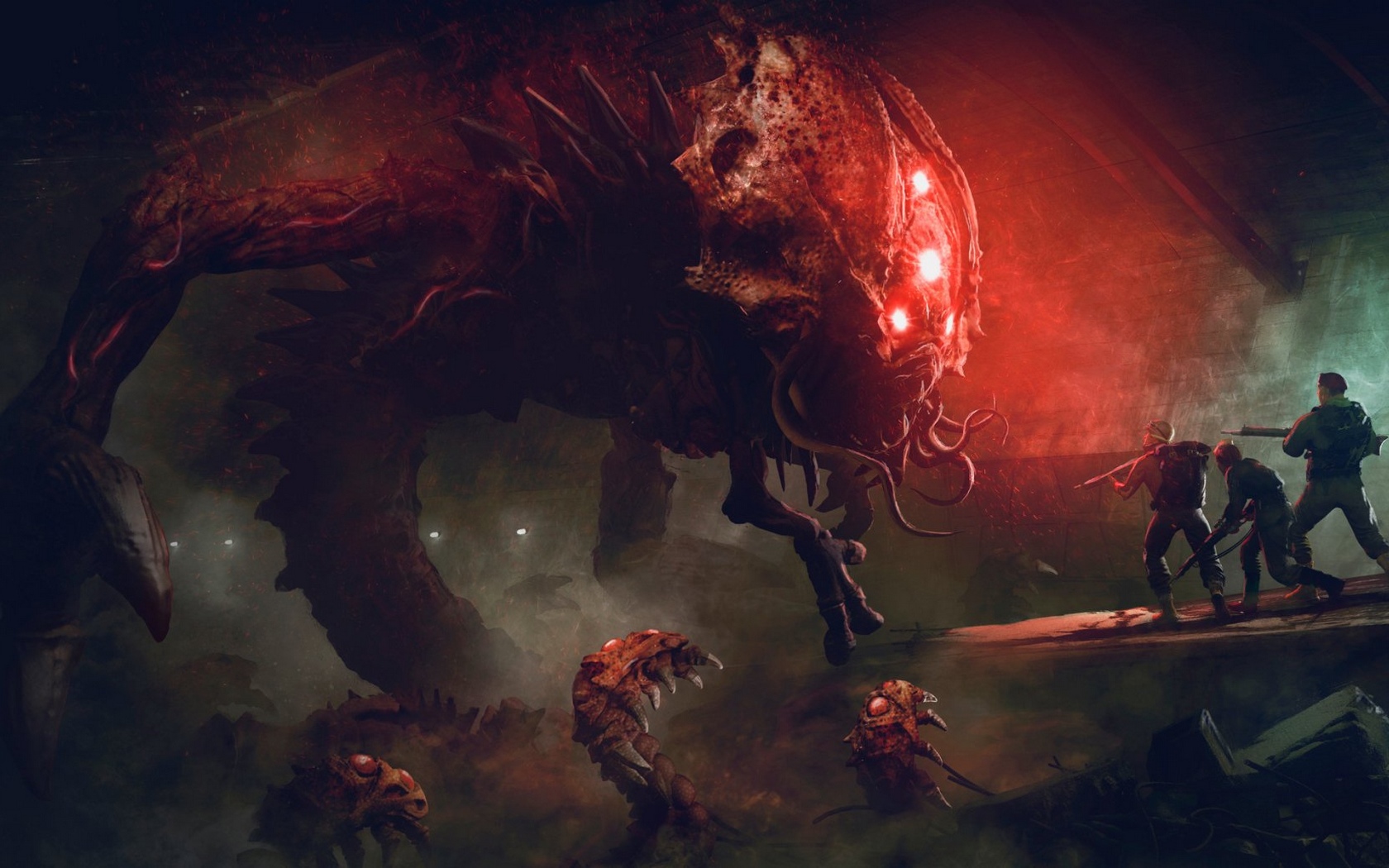 Description: A group of people standing in front of a giant alien creature in a dark room with red lights on.