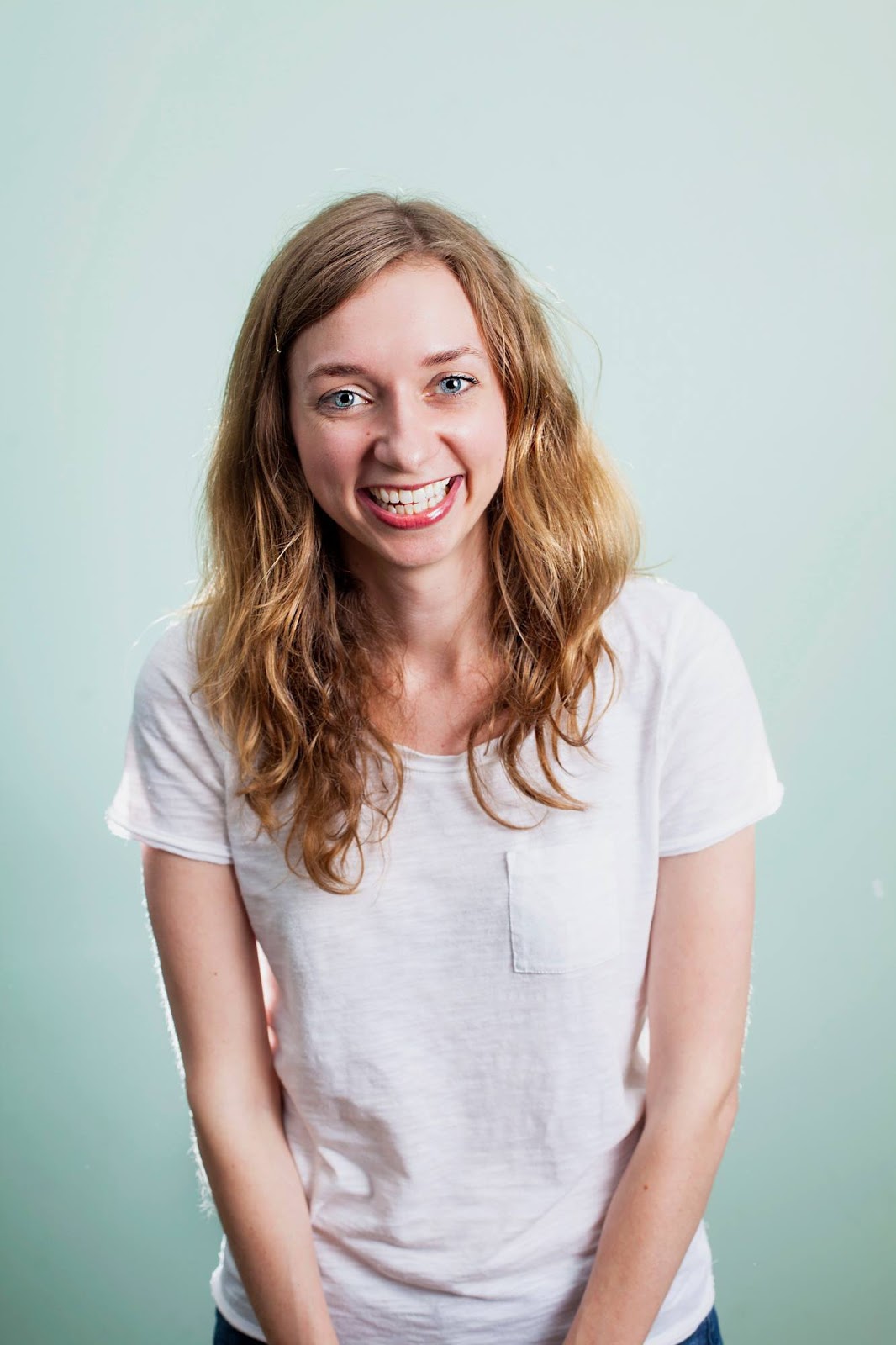 Description: A woman with long hair and a white shirt smiling at the camera with a toothy grin on her face.