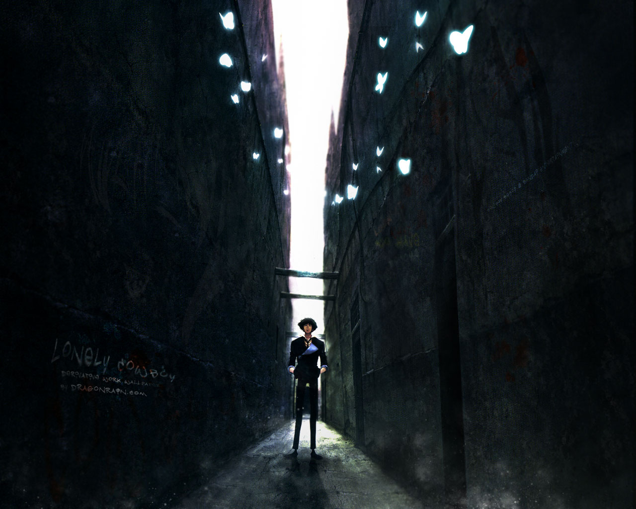 Description: A man standing in a narrow alley way with a light shining down on him and a wall with graffiti on it.