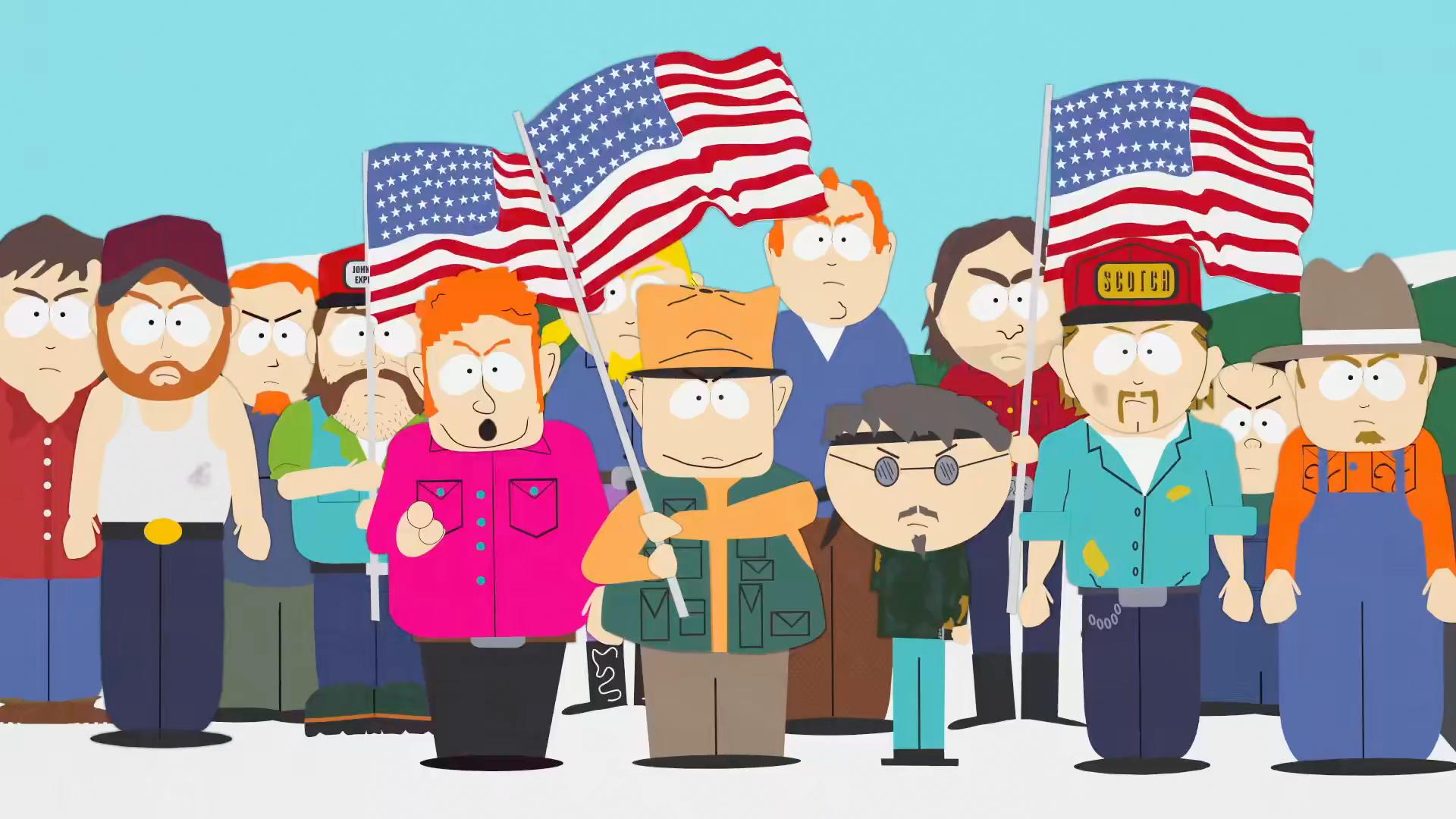 Description: A group of people with american flags on their heads and a man in a pink shirt and a man in a blue shirt.