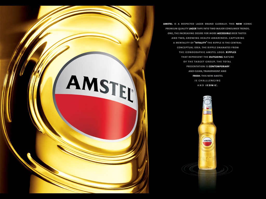 Description: A bottle of amstel is shown with a black background and a gold frame around it and a red and white circle.