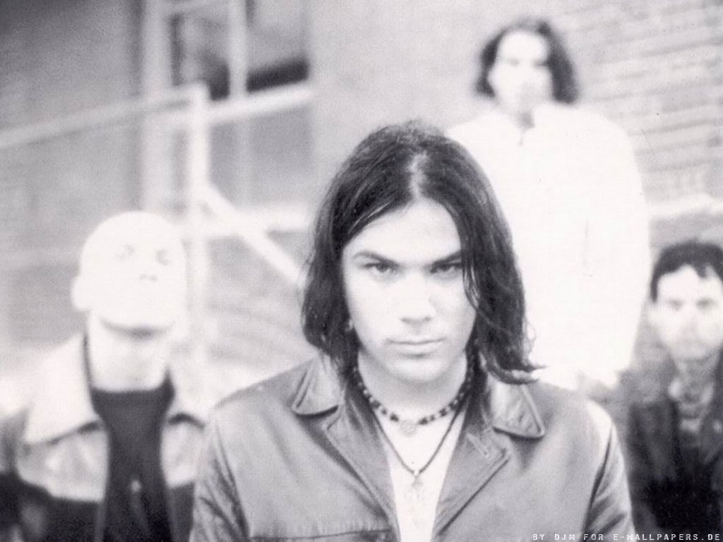 Description: A man with long hair and a leather jacket standing in front of a brick building with a group of people behind him.