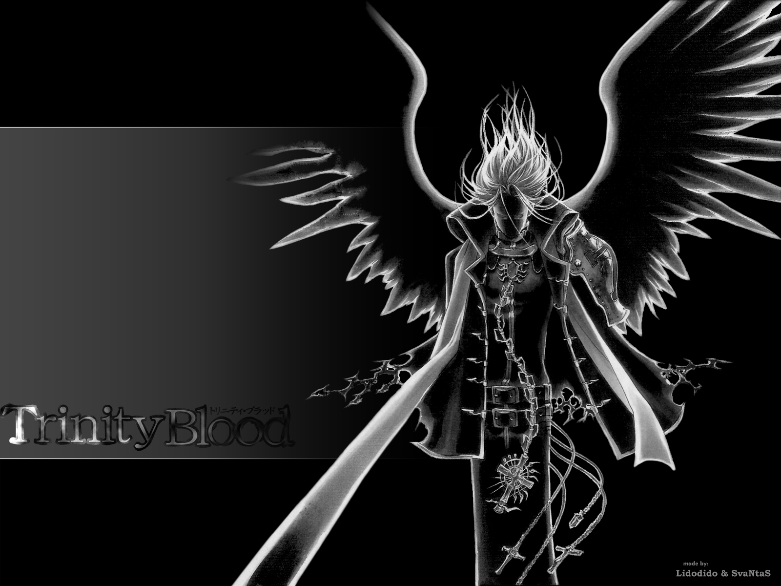 Description: A black and white photo of an angel with wings on it's back ground.