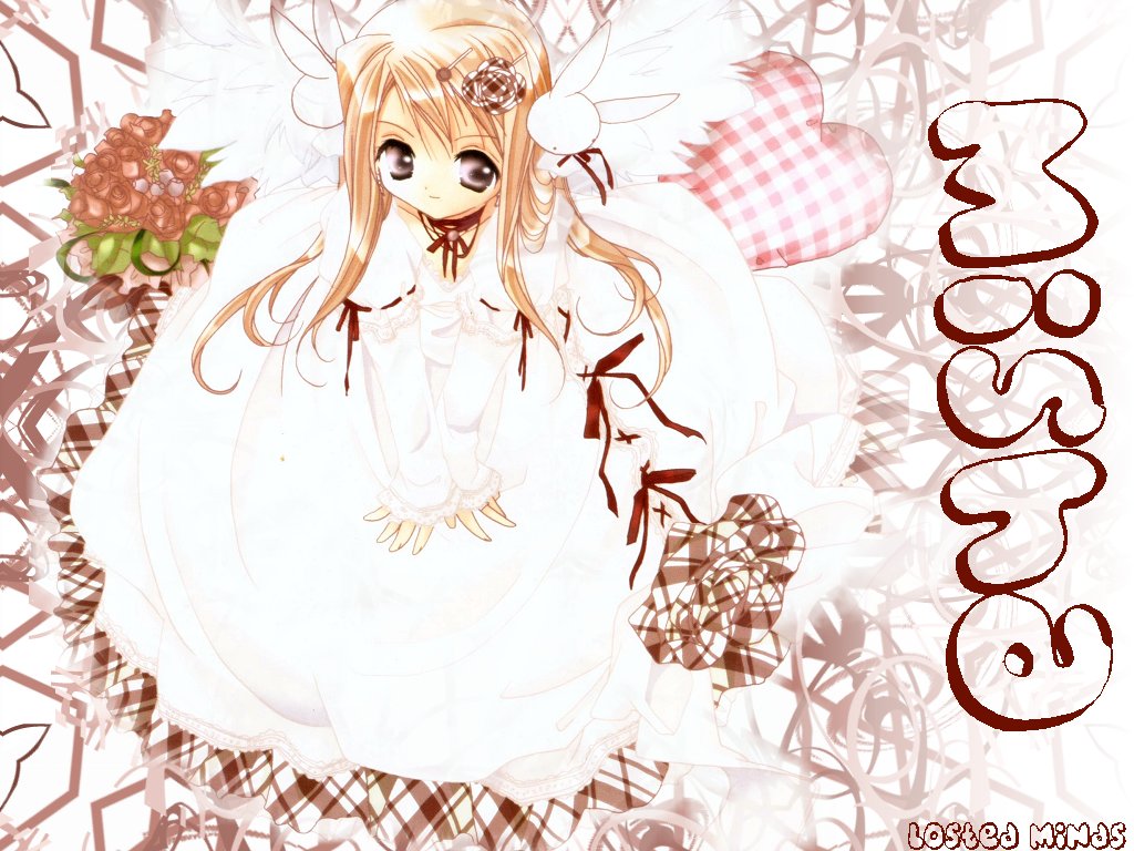 Description: A drawing of a girl with a white dress and a flower in her hair and a bow in her hair.
