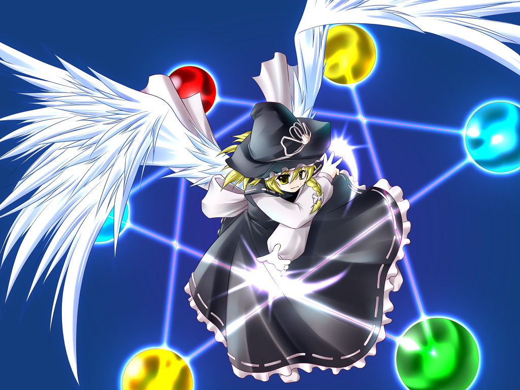 Description: A cartoon character with white wings and a black dress and hat with a black hat and white wings.