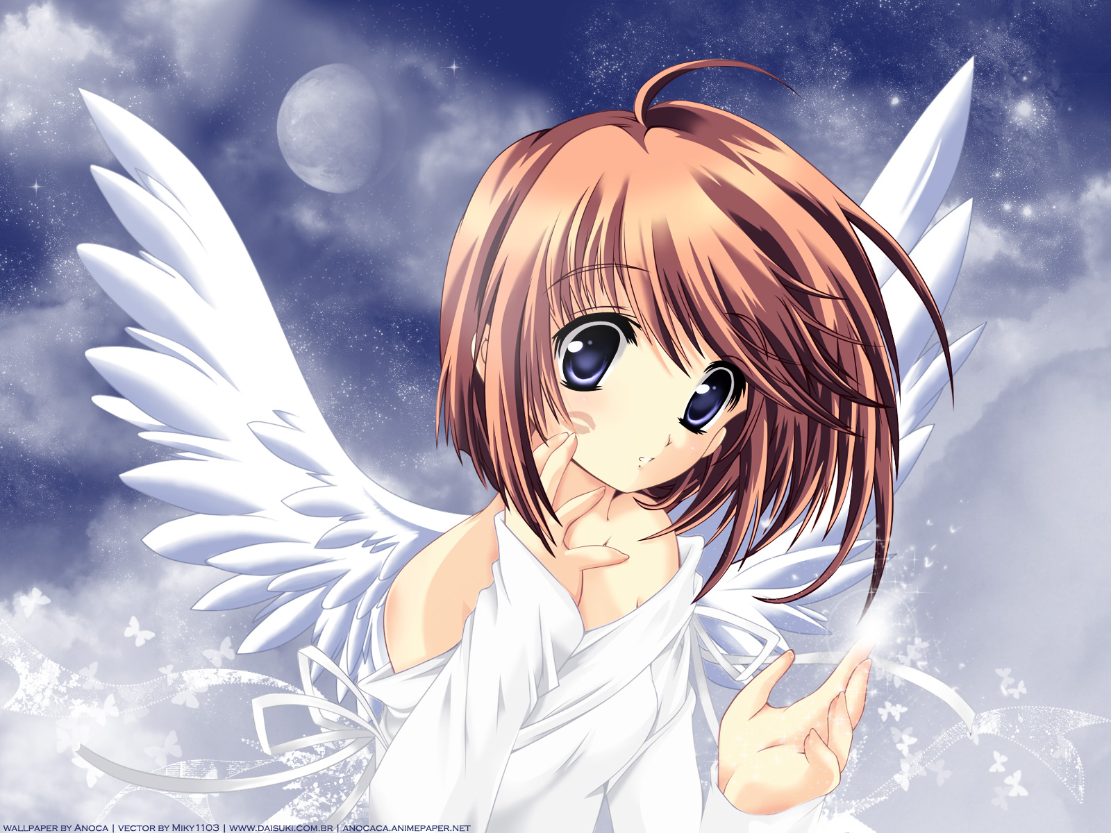 Description: A girl with angel wings in the sky with stars around her and a blue background with clouds and stars.