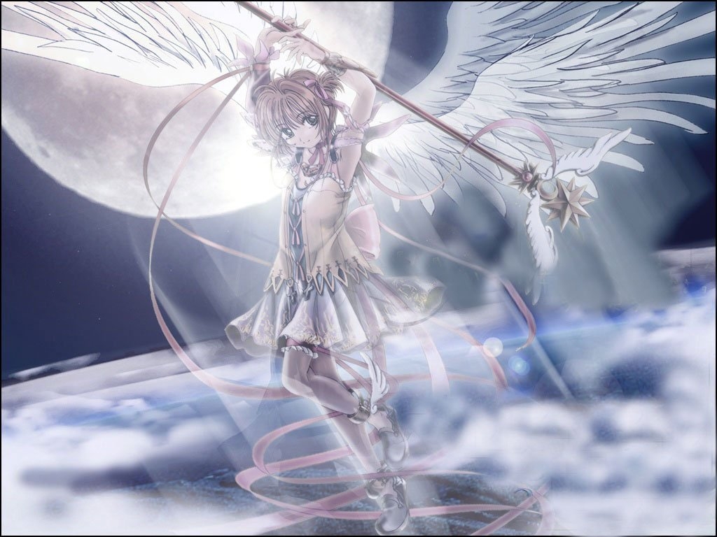 Description: A girl with a sword and wings standing on a cloud with a moon in the background and a full moon in the sky.
