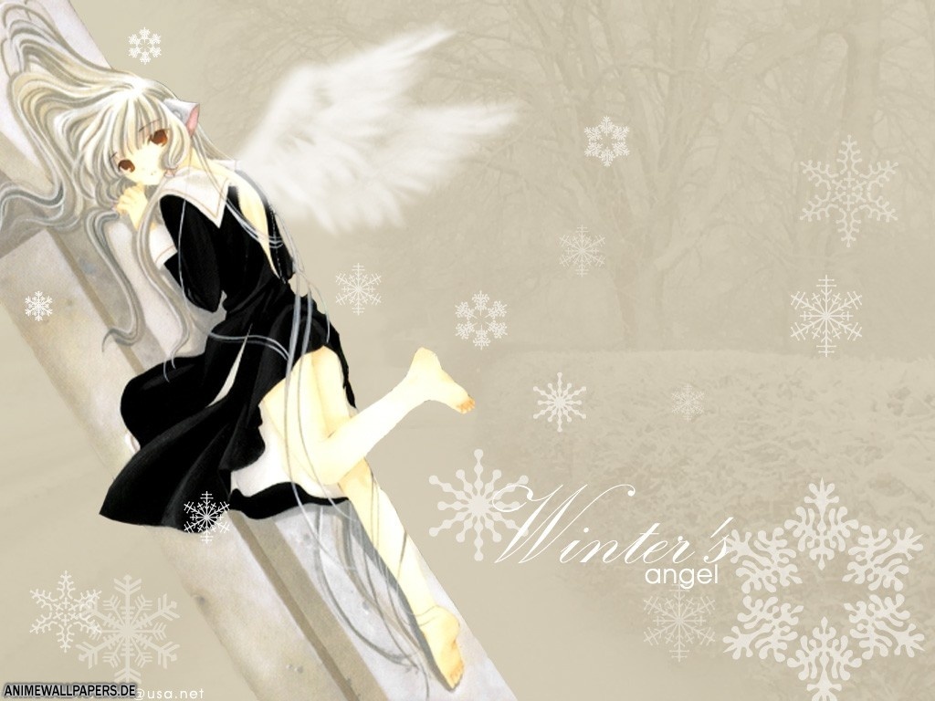 Description: A woman sitting on a bench with a white angel on it's back and snowflakes in the background.