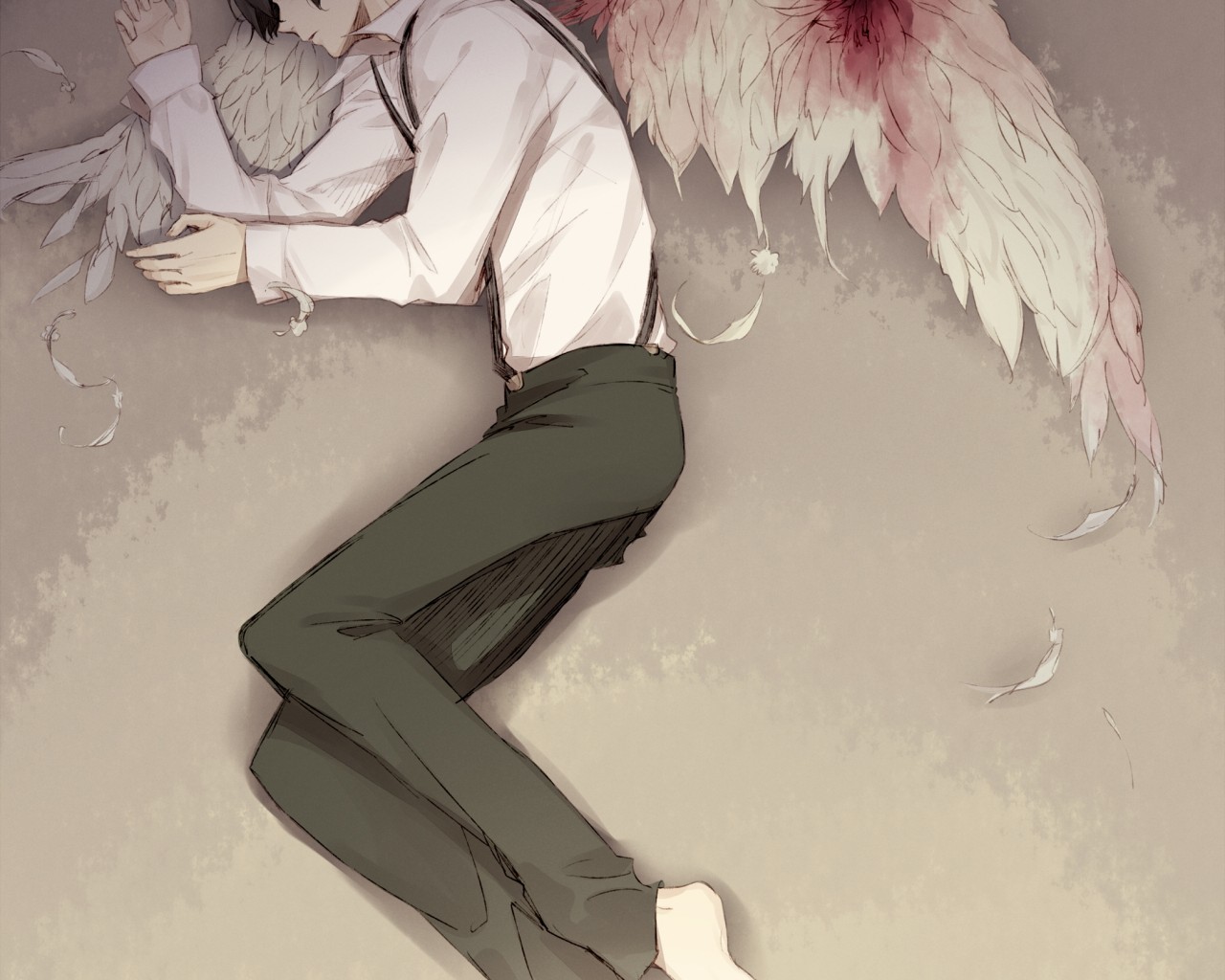 Description: A man with a white shirt and green pants is holding a pink flower and a white umbrella with wings.