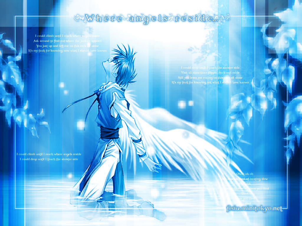 Description: A man with a sword standing in the water with wings flying around him and a blue background with a white angel.